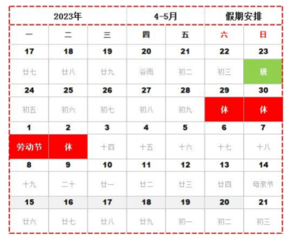 Se acerca el feriado del Primero de Mayo de 2023. De conformidad con las normas legales nacionales sobre vacaciones y teniendo en cuenta la situación actual de nuestra empresa, le informamos sobre el acuerdo de vacaciones de la siguiente manera: