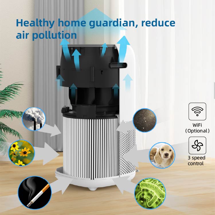 El sensor de monitoreo profesional y avanzado, el panel de control de detección en tiempo real y el filtro HEPA ayudan al purificador de aire a proporcionar una retroalimentación precisa de la calidad del aire en 4 colores diferentes que son fáciles de ver para el cliente.