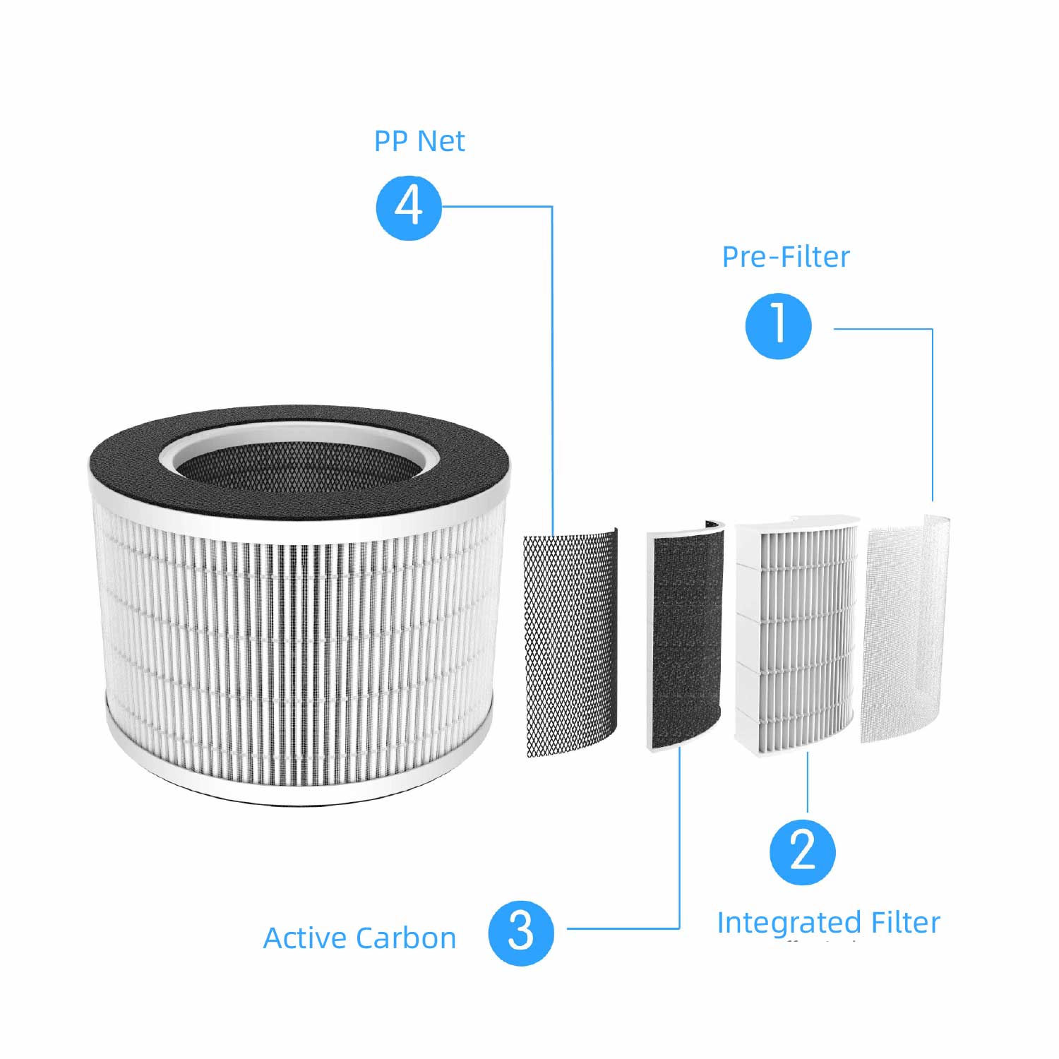El filtro de este purificador de aire tiene tres capas. El filtro de carbón activado adopta un diseño celular, puede eliminar eficazmente el olor a cocina, el olor a humo y otros olores. El filtro HEPA 13 se utiliza para eliminar eficazmente el 99,97 % de los alérgenos sensibles, como asma y tos, caspa de mascotas, pelo, polen y partículas pequeñas de hasta 0,3 micras.